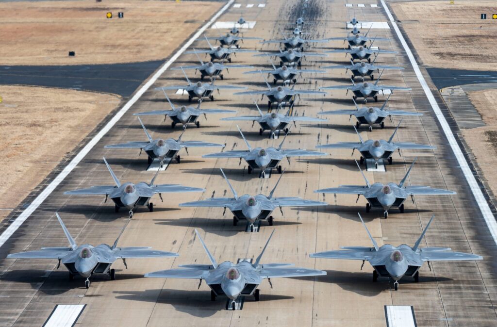 O caça de superioridade aérea por excelência. Velocidade máxima Mach 2.25+ com supercruise (voo supersônico sem pós-combustão), stealth superior em algumas frequências de radar e manobrabilidade extrema. Vantagem principal: domínio total do ar em combates 1×1 ou contra múltiplos alvos. Limitações: alto custo de manutenção, baixa disponibilidade (cerca de 60-70% operacionais) e produção encerrada.