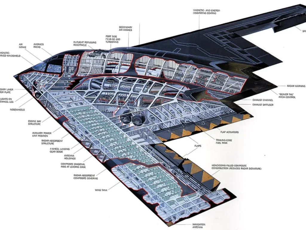 Bombardeiro stealth de 5ª geração. Alcance intercontinental (6.000 milhas náuticas sem reabastecimento), payload de 40.000 lb e RCS (radar cross-section) de aproximadamente 0,1 m². Ainda é o rei dos bombardeiros furtivos, mas caro (US$ 2 bilhões por unidade) e com manutenção complexa.Diferenças principais: